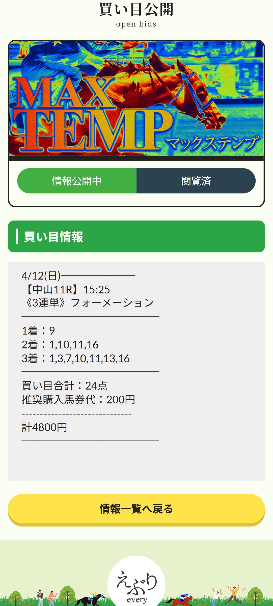 正直、えぶりのマックステンプはこの5本の中でもいちばん「買い目のセンス」を感じました。4月12日の中山11R・春雷Sで、1着固定にしていた9番クラスペディアがそのまま押し切り。しかも2着には後方から上がり33.0で突っ込んだ16番、3着には9番手追走から伸びた7番まで入って、着順は9→16→7。3連単は1,348,970円だったので、推奨通り1点200円で入っていた自分は4,800円が2,697,940円になりました。5人気の9番を頭で決め打ちしながら、人気薄の16番を2列目、差し込みの7番を3列目で拾っているのが本当にうまいです。