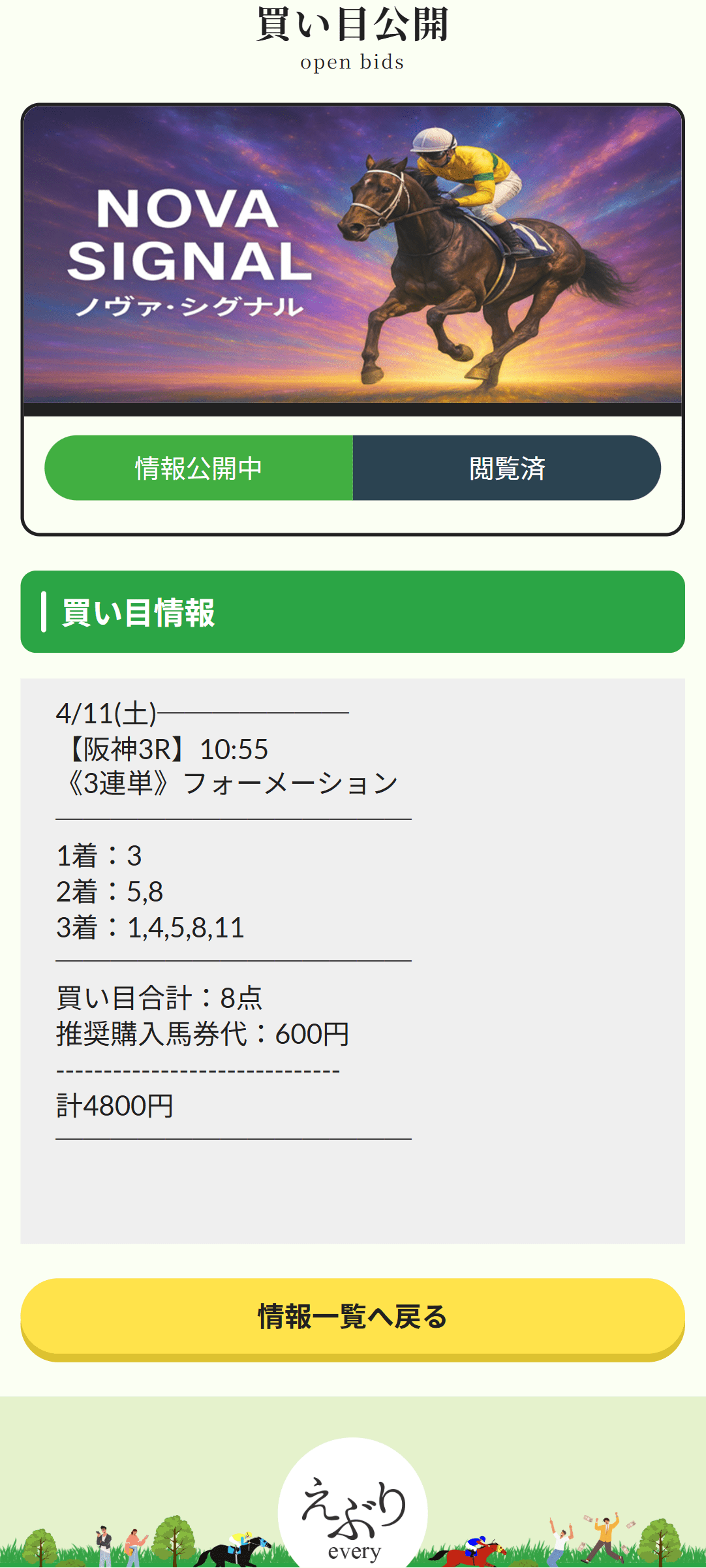 朝から夕方まで立ちっぱなしの販売の仕事をしてると、増えるか分からないことに大きく張る気なんて正直起きません。だから、えぶりのノヴァ・シグナルみたいに、4月11日阪神3Rを8点・計4,800円でまとめてくれる情報はかなり助かります。